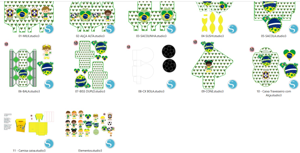 CONTÊM: Caixa milk, Caixa alça alta, Sacolinha, Caixa sushi, Sacola, Caixa bala, Caixa Bis duplo, Caixa bola, Caixa cone, Caixa travesseiro, Caixa camisa.