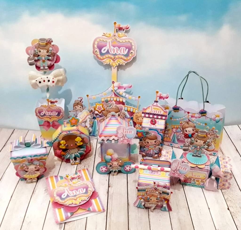CONTÊM: CAIXA MILK, CAIXA COM ALÇA, CAIXA BALA, CAIXA CUBO ALTA, CAIXA SUSHI COM LAÇO, CARRINHO DE PIPOCA, CARTOLA, CAIXA DE PIPOCA, CENTRO DE MESA, SACOLINHA, CONVITE, TOPO DE BOLO, CAIXA GAIOLA E CAIXA RODA GIGANTE.