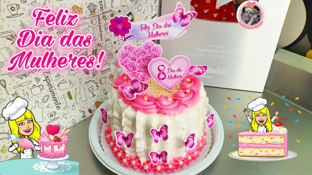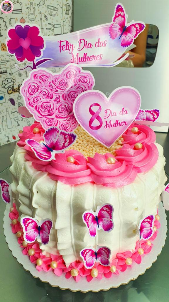 Confeitando Bolo para Iniciantes – Decoração de Bolo para o dia das mulheres no tamanho 15 X 10 CM, pesando 1.500 KG com 3 Camadas de pão de ló branca, 2 camadas de recheio de ninho e cobertura de chantilly.