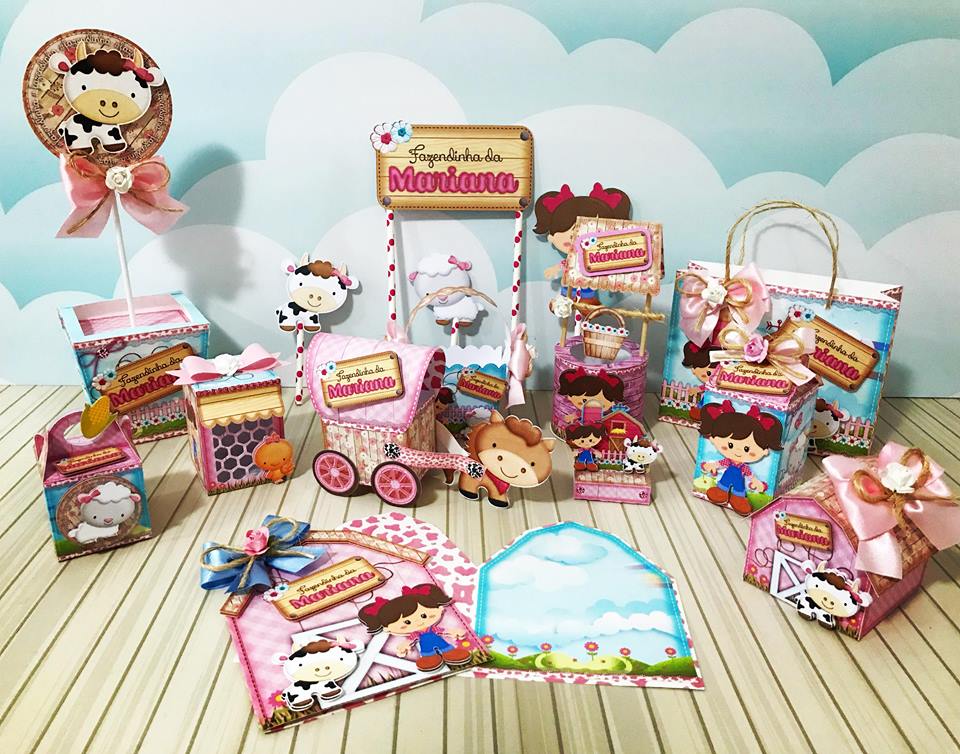 CONTÊM: CAIXA MILK, CARROCINHA, POÇO DOS DESEJOS, CELEIRO, CAIXA CUBO ALTO, CAIXA ALÇA PEQUENA, CAIXA BIS DUPLO, CESTINHA, CENTRO DE MESA, SACOLINHA, CONVITE, TOPO DE BOLO, BONECA COM CABELO LOIRO, PRETO, MARRON E VERMELHO.