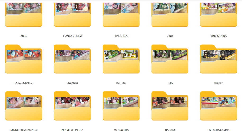 CONTÊM 23 TEMAS: ARIEL, BRANCA DE NEVE, CINDERELA, DINO, DINO MENINA, DRAGON BALL Z, ENCANTO, FUTEBOL, HULK, MICKEY, MINNIE FADINHA ROSA, MINNIE VERMELHA, MUNDO BITA, NARUTO, PATRULHA CANINA, PEDRITA, PEQUENO PRÍNCIPE, PLIMPLIM, SAKURA, SEREIA, SONIC, UNICÓRNIO E WANDINHA.