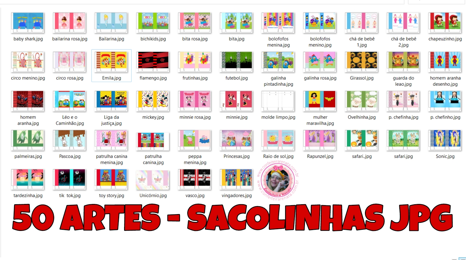 CONTÊM: 1 MOLDE LIMPO + 49 ARTES – SACOLINHAS VÁRIOS TEMAS PARA LEMBRANCINHA DE FESTA INFANTIL.
