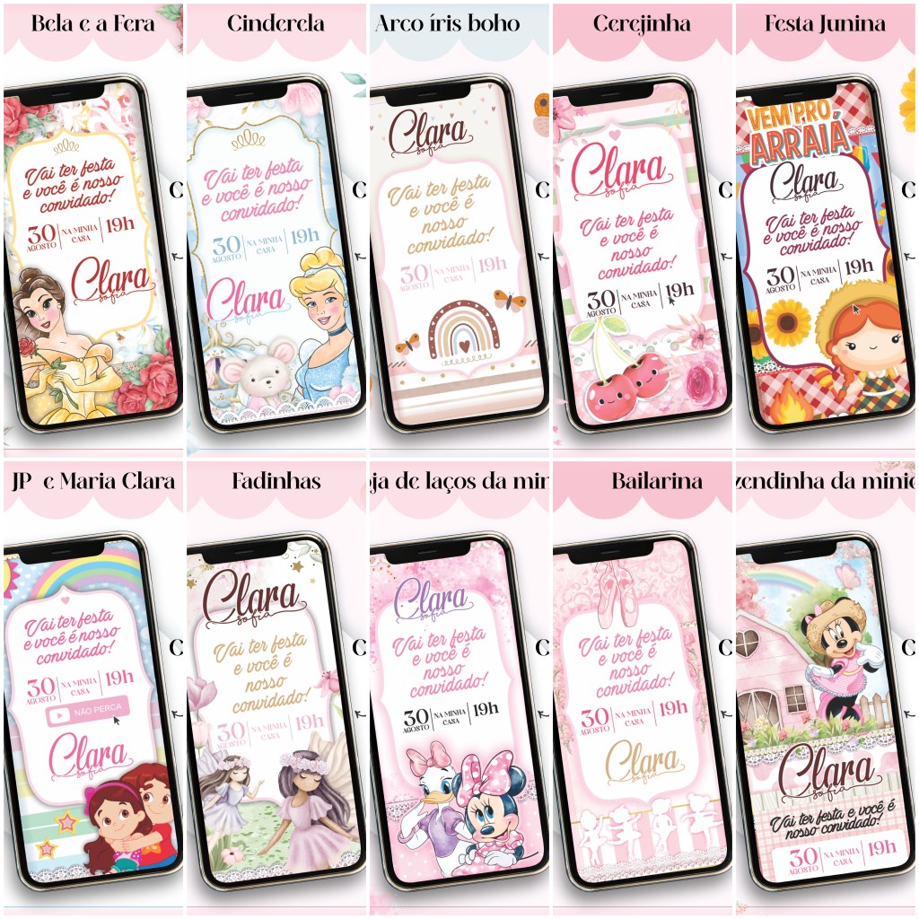 “10 CONVITES DIGITAIS FEMININO” 100 % digital, arquivos PNG + PDF. CONTÊM 10 TEMAS: CINDERELA, BELA E A FERA, MARIA CLARA E JP, FESTA JUNINA, CEREJINHA, ARCO-ÍRIS BOHO, FADINHAS, FAZ. MINNIE, BAILARINA, LAÇOS MINNIE.