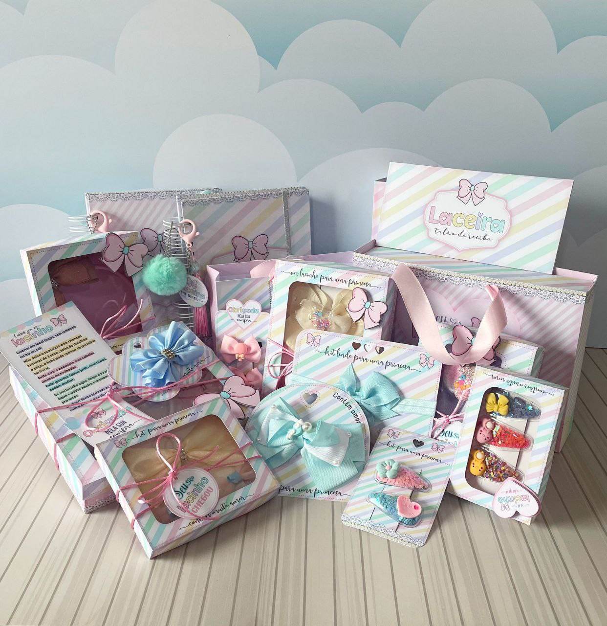 CONTÊM: AGENDA, TALÃO DE RECIBOS, CAIXA BIG KIT LAÇOS, CAIXA PARA 3 FIVELAS, CAIXA PARA TIARA E FIVELINHA, CAIXA PARA 1 LAÇO, CAIXA PARA 2 LAÇOS, 2 CAIXAS PARA TIARA, 2 LAPELAS PARA 2 PRESILHAS, LAPELA NUVEM, LAPELA PARA TIARA MAIS PRESILHA, LAPELA PARA LAÇO, 2 SACOLAS PARA LAÇO, TAG CUIDADOS E FOTOS.