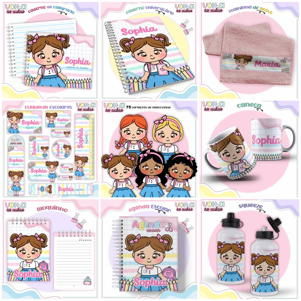 Contém: 10 MODELOS DE ETIQUETAS, MARCA PÁGINA, RÉGUA, CADERNO A5, CADERNO COLEGIAL / UNIVERSITÁRIO, CAPA CADERNO DE DESENHO, CADERNO DE CALIGRAFIA, CAPA PARA AGENDA, BLOQUINHO A6, ARTE PARA CANECA, ARTE PARA SQUEEZE, ARTE PARA TOALHINHA, BOLSINHO, ELEMENTOS E 75 VARIAÇÕES DE MASCOTINHAS (em cores variadas de pele e cabelo), FONTE E MOCKUPS.