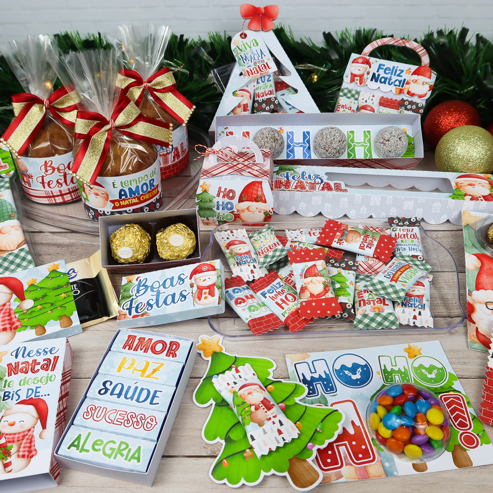 CONTÊM: ARTES PARA BALINHAS, ÁRVORE PARA BALINHAS, CARD PARA BALINHAS, CAIXA TRIANGULAR PARA BALINHAS, CAIXA PRESENTE PARA BALINHAS, LAPELA, CAIXINHA PARA CHICLETE FLICS, CARD PARA CHICLETE FLICS, CARTÃO PARA BLISTER, CARD PARA BLISTER, EMBALAGEM PARA CHOCOLATE 20G, EMBALAGEM PARA CHOCOLATE 90G, CAIXA PARA 1 BOMBOM, CAIXA PARA 2 DOCES, CAIXA PARA 5 BIS, CAIXA PARA 3 DOCES, TAGS FRENTE E VERSO, TAGS FRENTE ÚNICA, PORTA BISNAGA, SAIA PARA PANETONE 80G, FRASES E FOTOS.