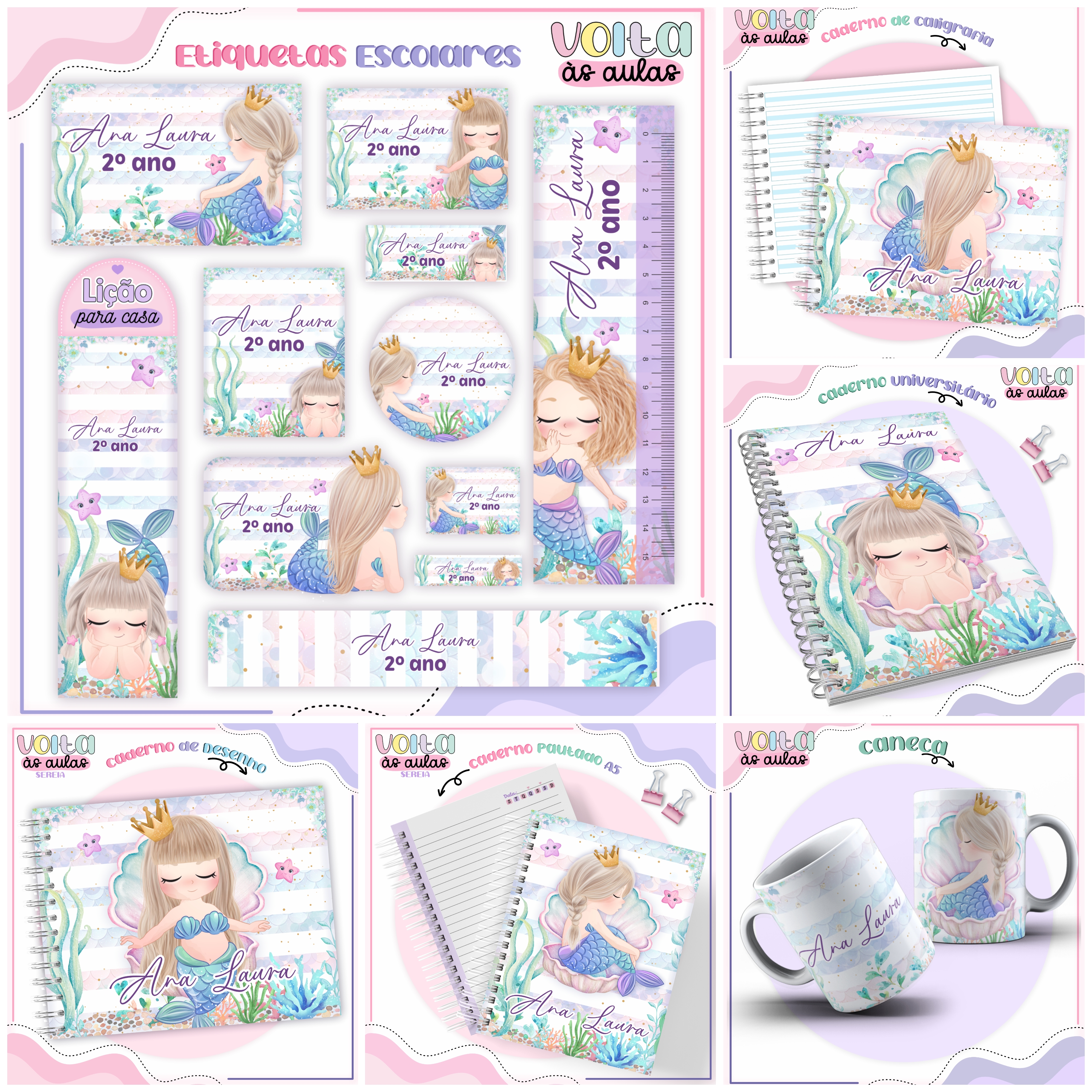Kit Volta às Aulas Sereia Etiquetas Escolares e Encadernação 2024 e 2025