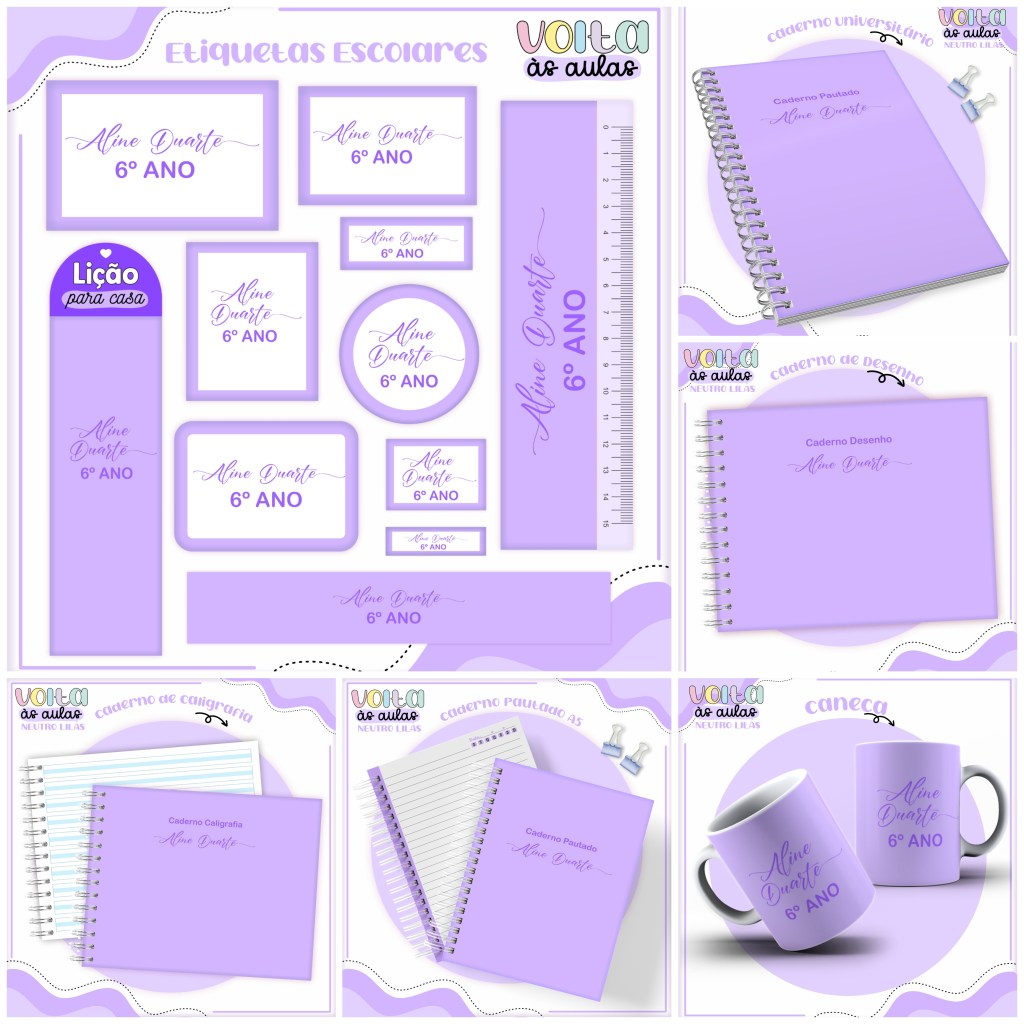 Kit Volta às Aulas Neutro Lilás Etiquetas Escolares e Encadernação 2024 e 2025