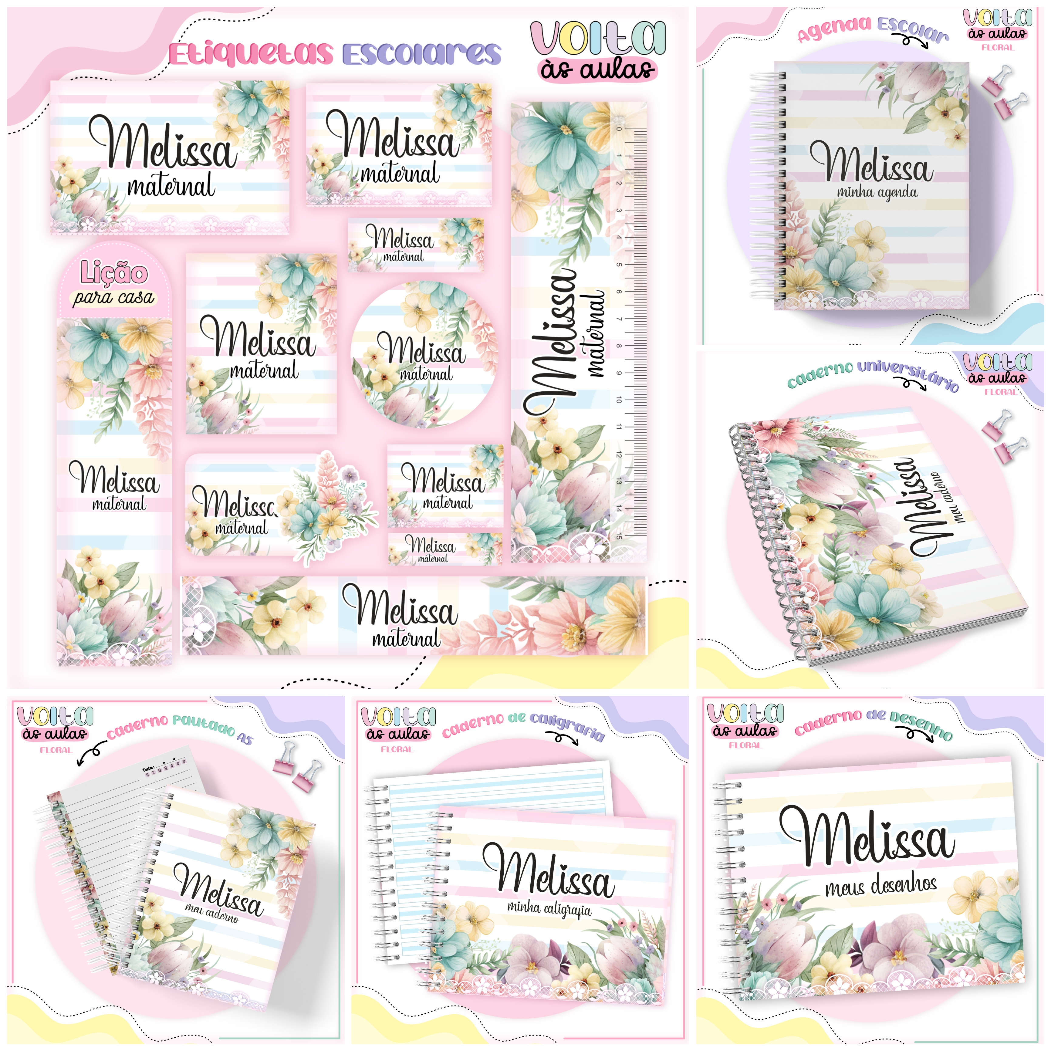 Kit Volta às Aulas Floral Etiquetas Escolares e Encadernação 2024 e 2025