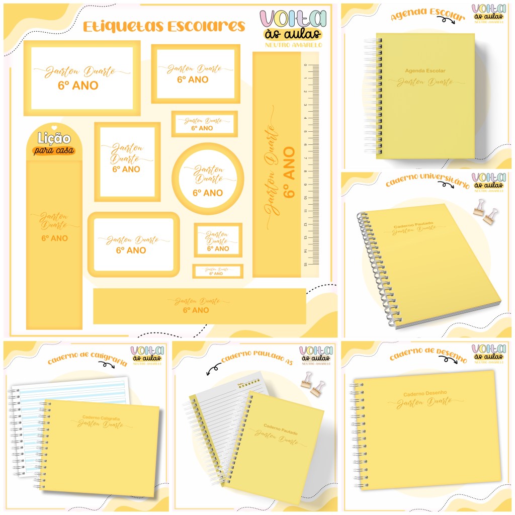 Kit Volta às Aulas Neutro Amarelo Etiquetas Escolares e Encadernação 2024 e 2025