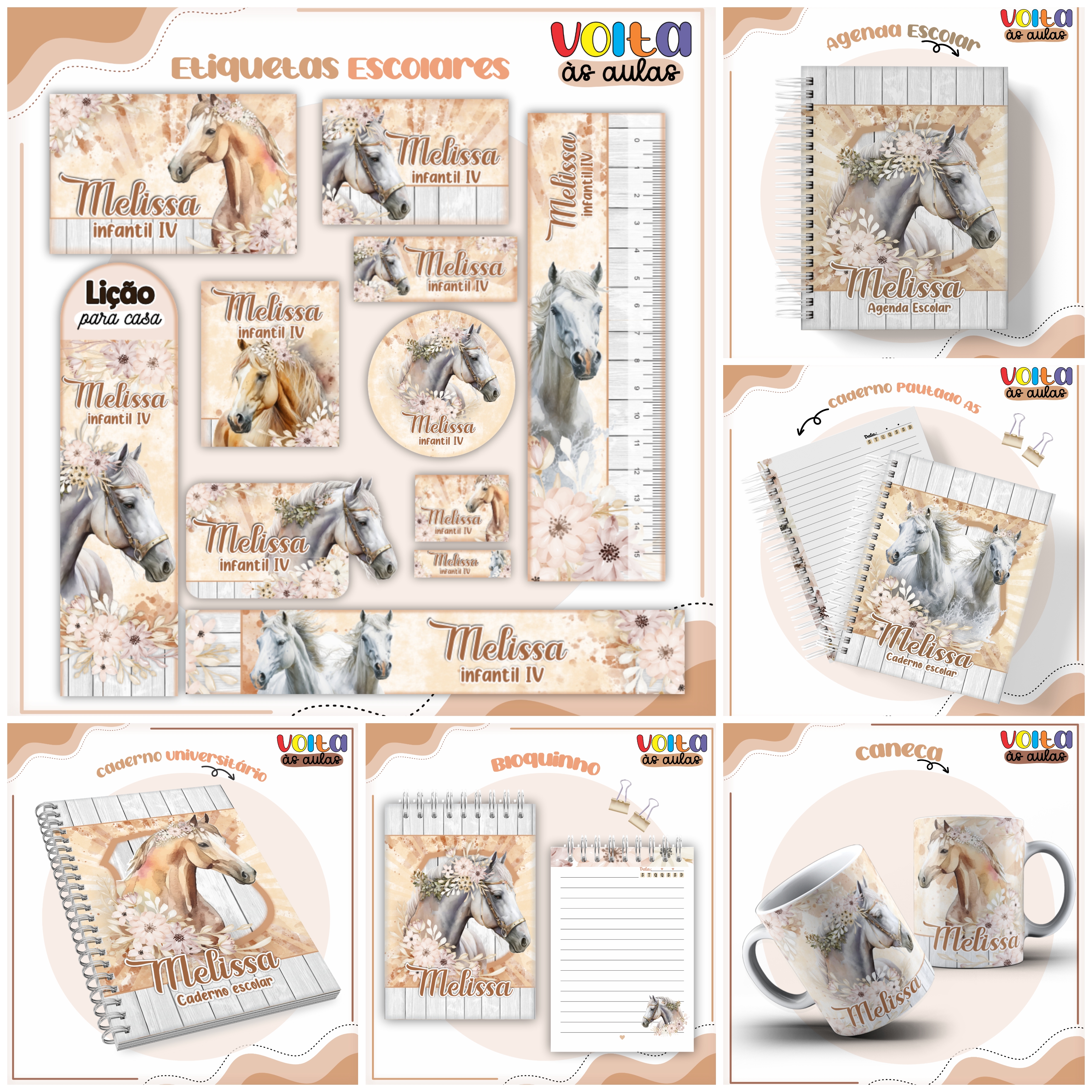Kit Volta às Aulas Cavalos Menina Etiquetas Escolares e Encadernação 2024 e 2025