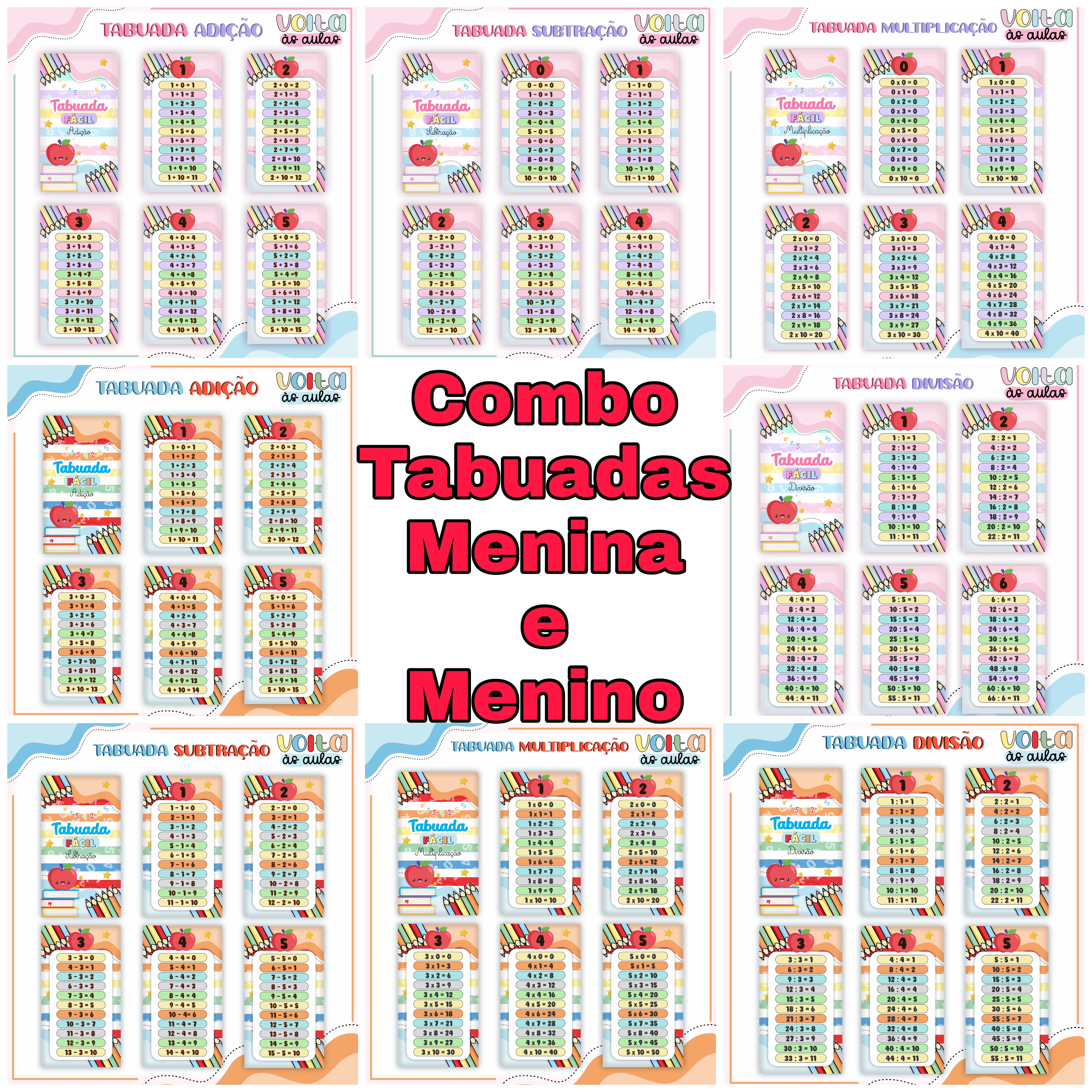 Combo Tabuadas Menina e Menino 100% Arquivo Digital em Png e Pdf