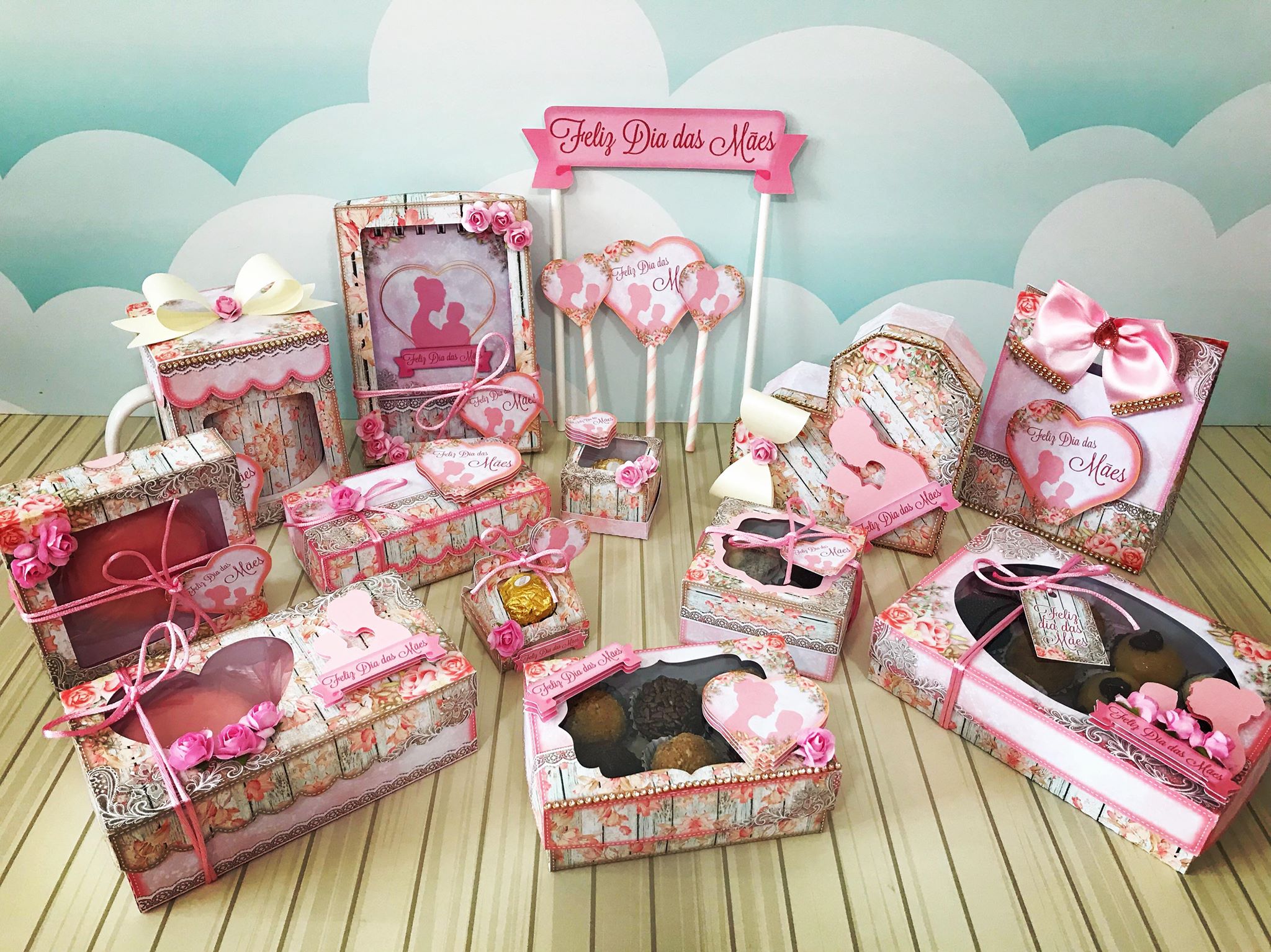 CONTÊM: Bloquinho, Caixa para 1 sabonete, Caixa para 1 doce, Caixa para 6 doces, Caixa para 4 doces, Caixa para 12 doces, Caixa Coração para bombons variados, Caixa para 2 sabonetes, Caixa para Prestígio, Caixa para caneca, Embalagem para Ferrero Rocher, Sacolinha, topo de bolo, fonte, elementos e fotos.