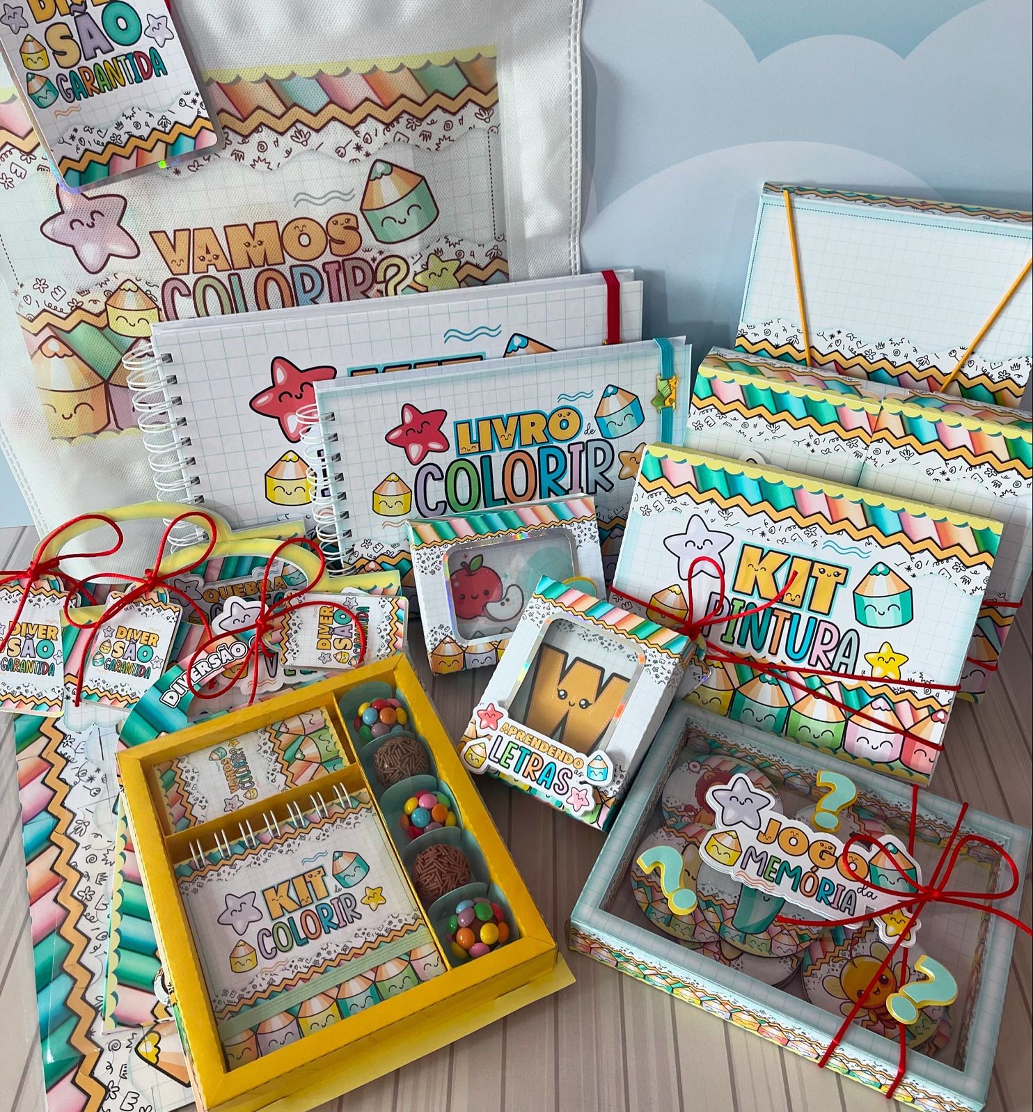CONTÊM: CAIXA DESLIZANTE, APRENDENDO AS LETRAS (A a Z), CARD QUAL A LETRA (A a Z), QUEBRA-CABEÇA, KIT PINTURA, JOGO DA VELHA, JOGO DA MEMÓRIA, CAIXA PORTA A5 COM CADERNO, SACOLINHA COM ATIVIDADES, KIT COLORIR, CADERNOS (Capa e Miolo), ALFABETO, ELEMENTOS, FONTES E FOTOS.