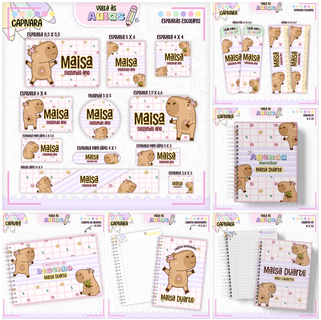 Kit Volta às Aulas Capivara Menina Etiquetas Escolares e Encadernação 2025 e 2026