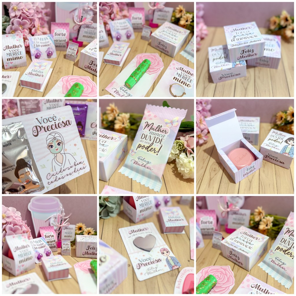 CONTÊM: ADESIVO KITKAT, ADESIVO MINI ESPELHINHO, CAIXINHA MULTIUSO, CARD CHOCOLATE BATON, CARD BATOM OU MANTEIGA DE CACAU, CARD POTINHO HIDRATANTE, CARD MINI ESPELHO CORAÇÃO, CARD BRINCO, CARD MÁSCARA FACIAL, CARD MÁSCARA LABIAL, CARD MINI PRENDEDOR, CARD MINI TUBETE ESCALDA PÉS, ADESIVO E CARD CHAVEIRO, CAIXINHA MINI BÍBLIA BIS, PORTA CHOCOLATE BATON, PORTA ESPONJINHA MAQUIAGEM, PORTA MINI LIXA, PORTA SACHÊ CAFÉ, TAGS, KIT DIGITAL E FOTOS.