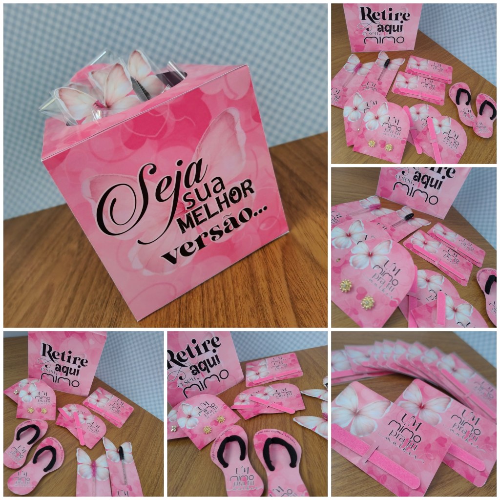 Contem: CAIXA RETIRE AQUI SEU MIMO, 2 CARDS MULTIUSO (para brinco, lixinha,…), CARD ESCOVINHA DE CÍLIOS E CHINELINHO PARA XUXINHA.