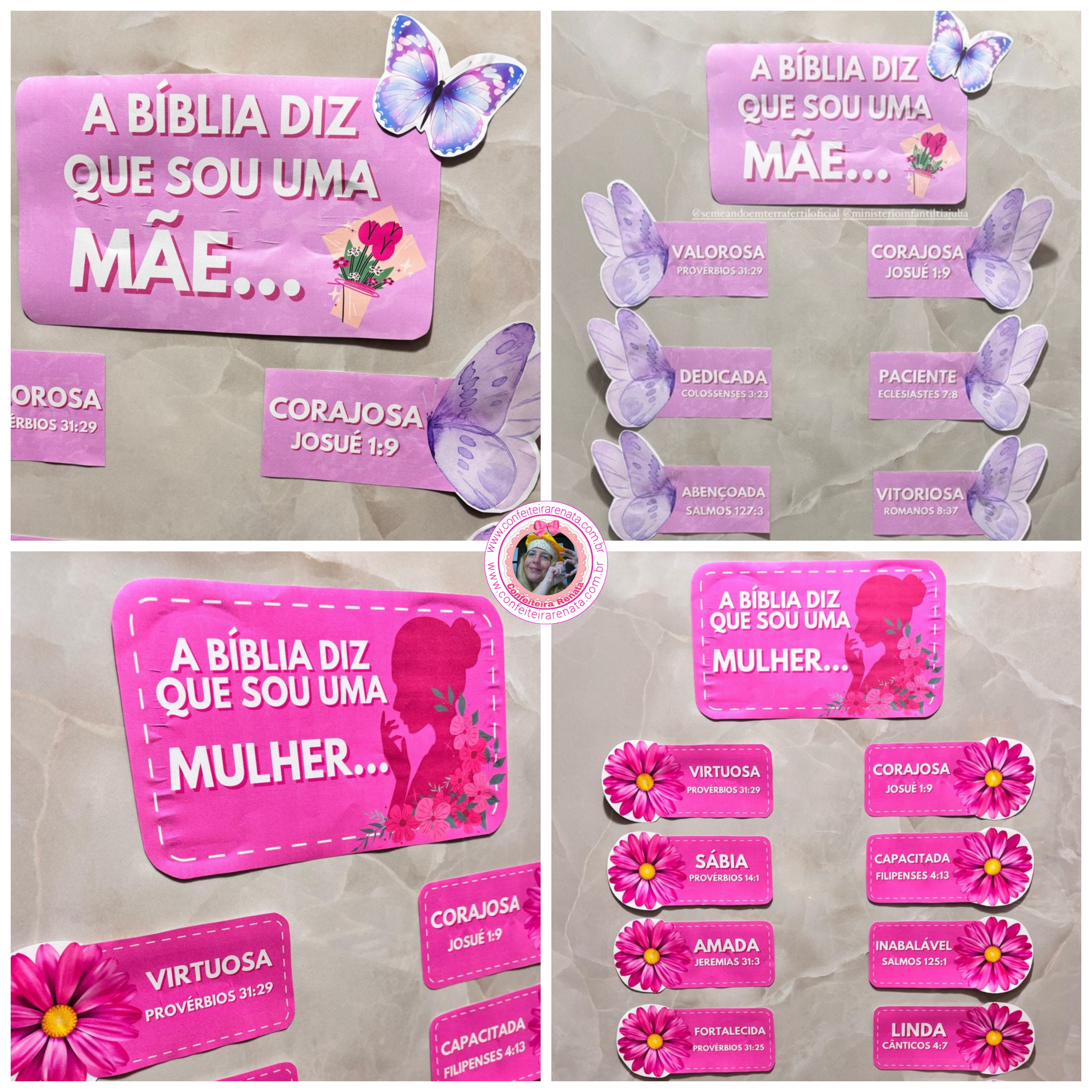 *Modelo 1 Dia das Mães: Placa – A BÍBLIA DIZ QUE SOU UMA MÃE…, 12 plaquinhas de afirmações com versículos bíblicos e borboletas.