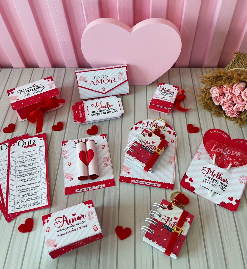 CONTÊM: MINI BÍBLIA (2 Capas e 20 Versículos), CAIXINHA VERSÍCULOS (135 Versículos), CARD PARA MINI BÍBLIA, CAIXA BÍBLIA 2 BIS, CAIXA ORAÇÃO, TICKET DO AMOR, CARD PARA PIRULITO CORAÇÃO, QUIZ DO CASAL, CARD PARA 2 CHOCOLATES BATOM, FONTES E FOTOS.