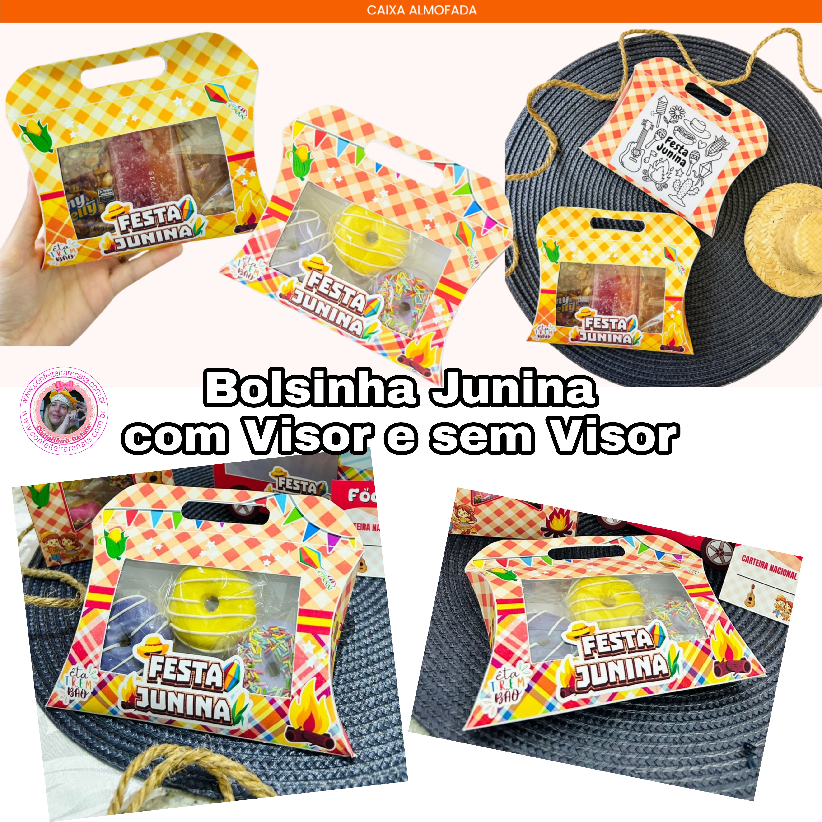 Arquivo de corte Caixa Almofada Festa Junina com Visor e sem Visor, com 4 Artes, com desenho para colorir no verso, 100% digital, arquivos nos formatos PNG e PDF e Brinde – Lapelas, Tags e Cartões.