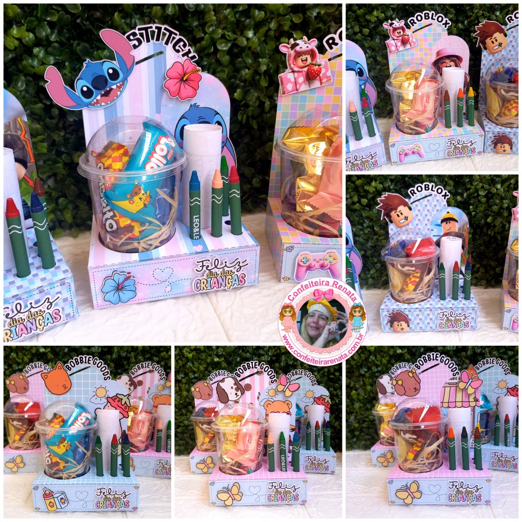 Arquivo de corte Cenário Copo Bolha + Colorir Dia das Crianças, com 8 artes nos temas: Bobbie Goods Azul, Bobbie Goods Rosa, Hello Kitty, Minecraft, Roblox Menina, Roblox Menino, Sonic e Stitch, 100% arquivo digital apenas nos formatos Silhouette Studio e PDF.