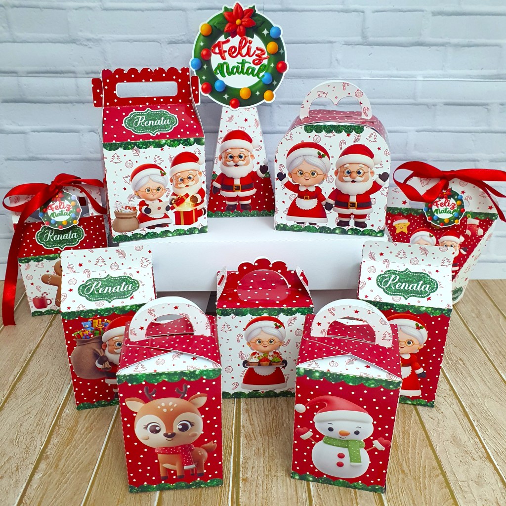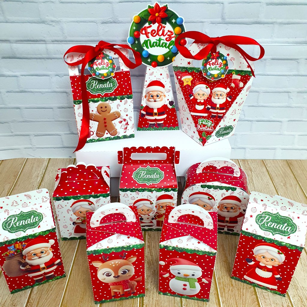CONTÊM: 2 CAIXA MILK (Papai Noel e Mamãe Noel), 2 CAIXA ALÇA (Boneco de Neve e Rena de Natal), MALINHA, CAIXA LANCHINHO, CAIXA CONE, SACOLINHA, MALETINHA, BOLSINHA, FONTES, FOTOS, KIT DIGITAL E BRINDES (Livrinho de Colorir e 2 Cadernos Receitas de Natal).