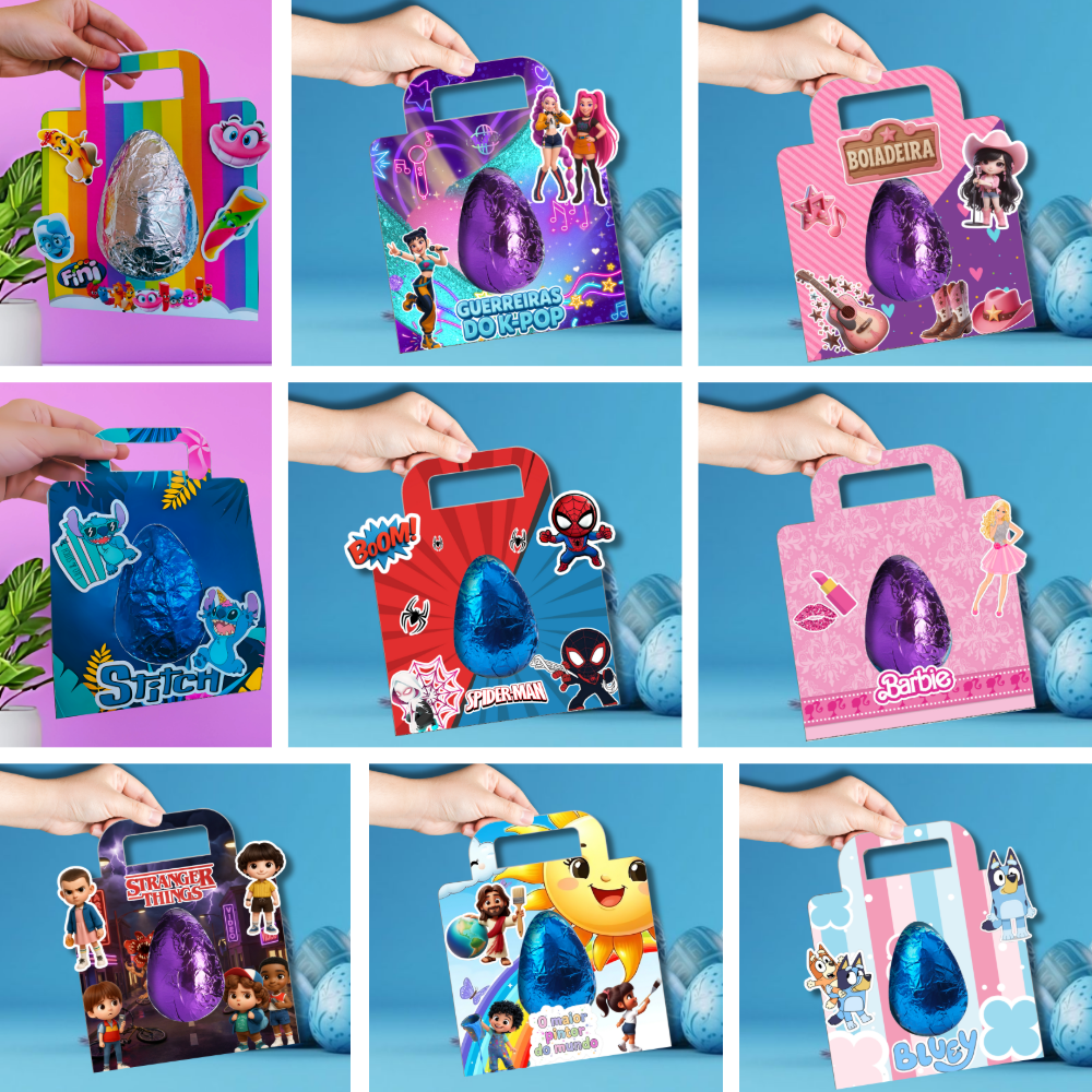 Arquivo de corte Sacolinha Porta Ovo Inteiro com 94 Artes, para Ovo de Páscoa de 150g, 250g e 350g, 100% digital, arquivos nos formatos PNG e PDF + Molde Limpo no formato Silhouette Studio.