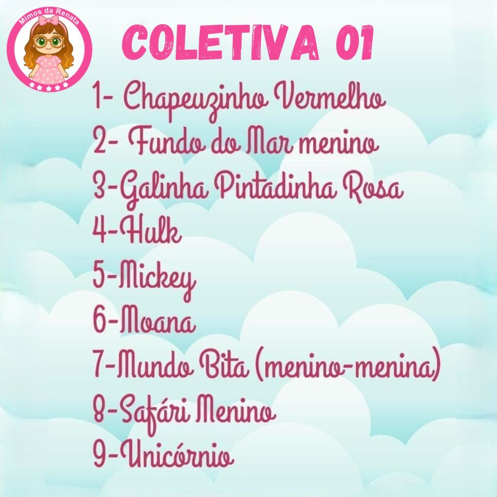 9 Temas: CHAPEUZINHO VERMELHO, FUNDO DO MAR MENINO, GALINHA PINTADINHA, HULK, MICKEY, MOANA, MUNDO BITA, SAFARI MENINO E UNICÓRNIO.