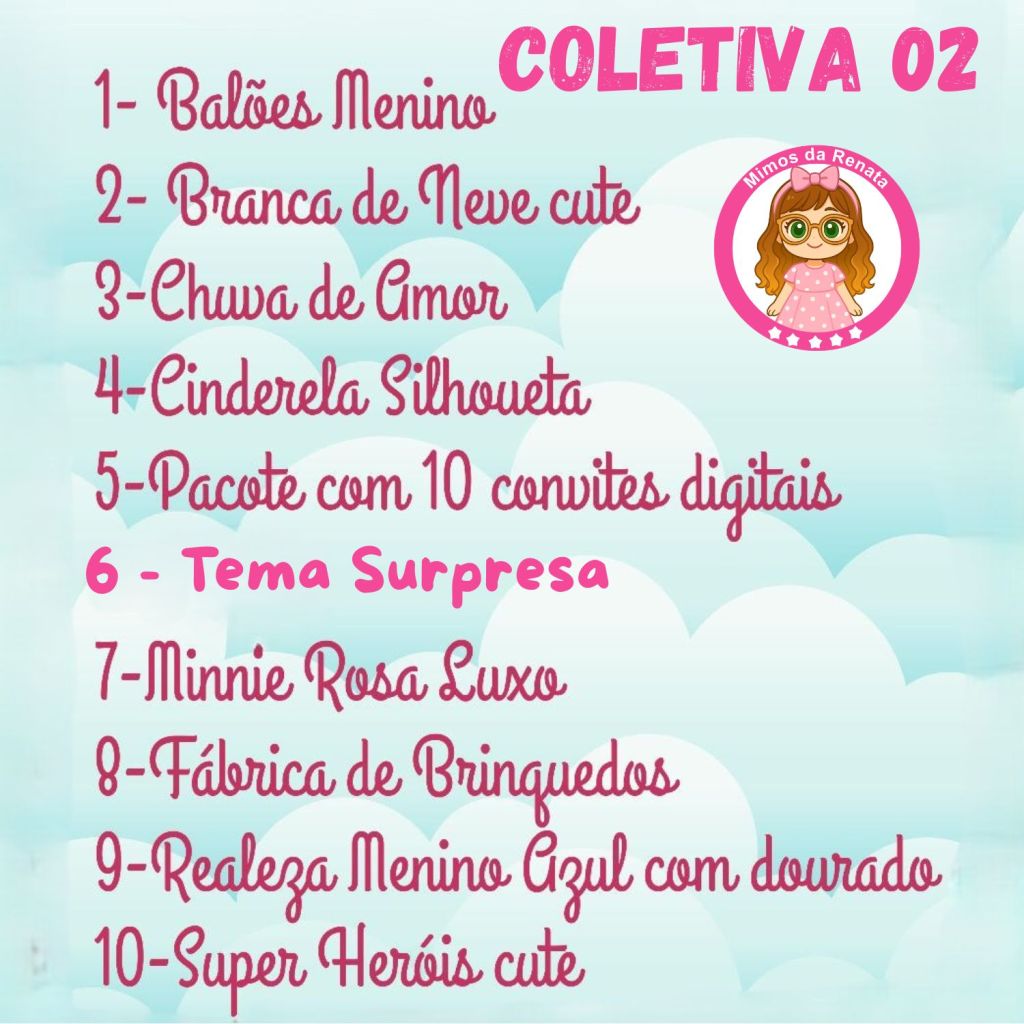 9 Temas: BALÕES MENINO, BRANCA DE NEVE, CONVITES DIGITAIS (BRINDE), CHUVA DE AMOR, CINDERELA, FÁBRICA DE BRINQUEDOS, TEMA SURPRESA, MINNIE ROSA, REALEZA MENINO E SUPER HEROIS.