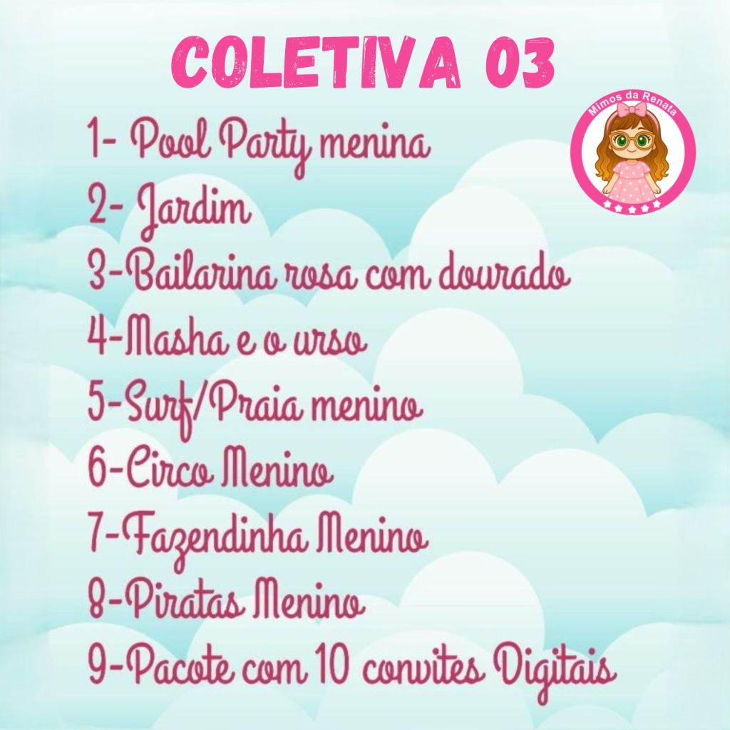 8 Temas: BAILARINA, CIRCO MENINO, CONVITES DIGITAIS (BRINDE), FAZENDINHA MENINO, JARDIM, MASHA E O URSO, PIRATAS, POOL PARTY MENINA E SURF PRAIA MENINO.