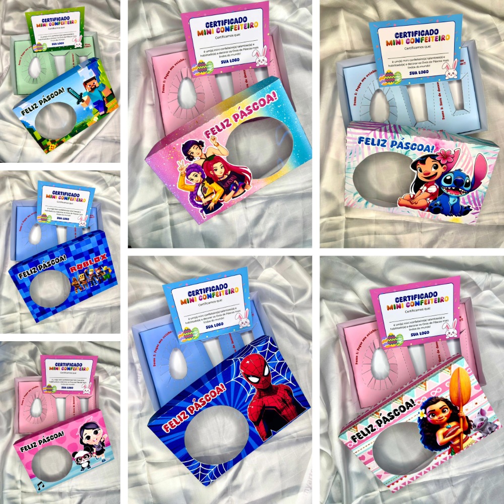 Arquivo de Corte Páscoa Caixa Mini Confeiteiro, para ovo até 250g, com 150 artes e Certificado de Mini Confeiteiro + Vídeo Aula Rápido, 100 % digital, arquivos nos formatos PNG e PDF.
